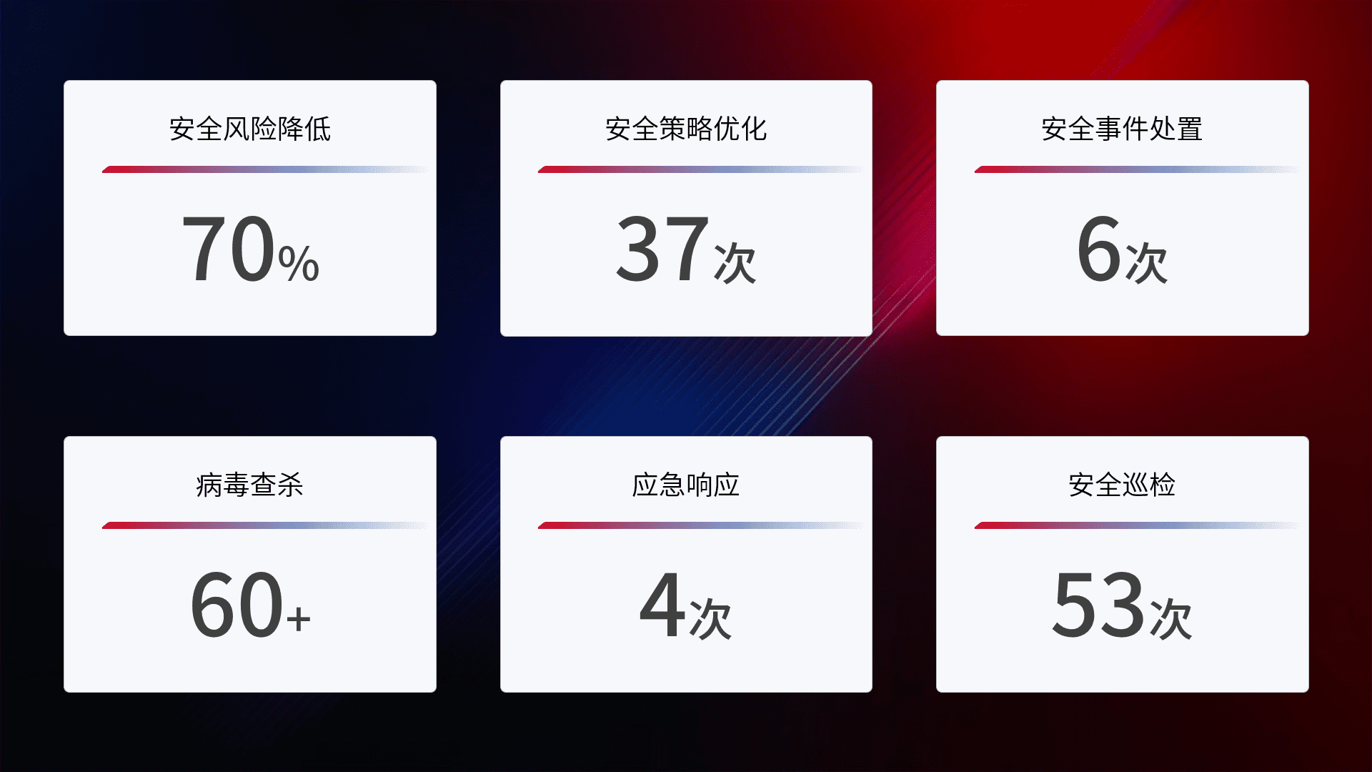 提供全面的安全事件报告体系,,包括处置报告、、、、周报、、季度和年度总结,,,,结合持续监控,,,帮助客户深入了解网络安全状况。。。。